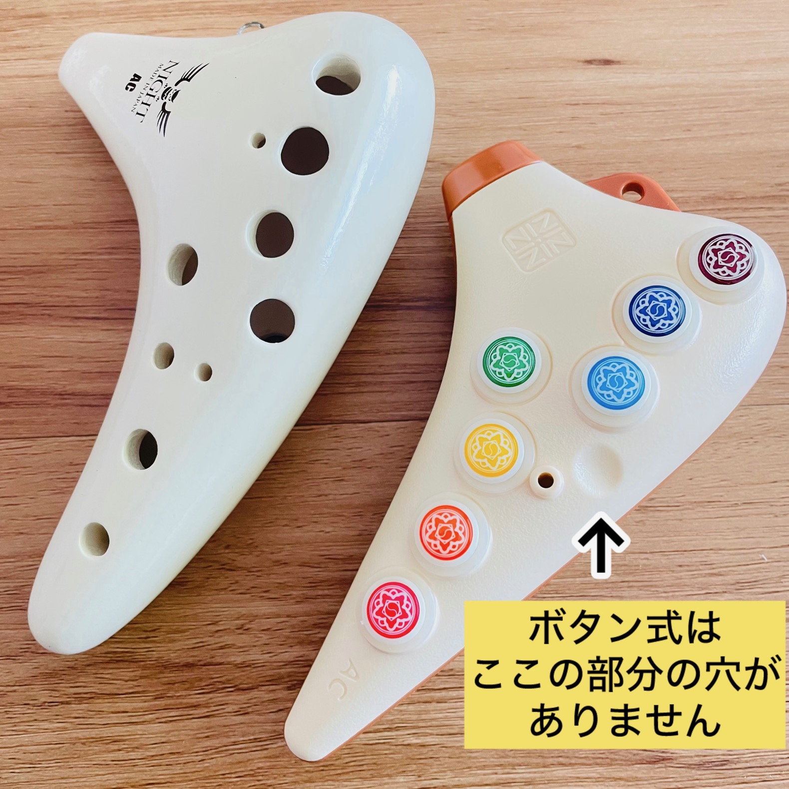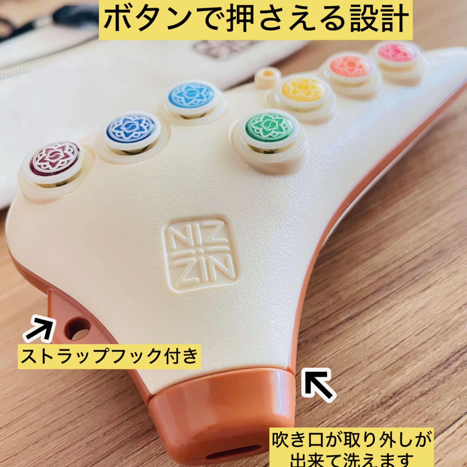 ZINボタン式プラオカリナの特徴として、表面のドレミファソラシドがボタン式のトーンホールになっています。